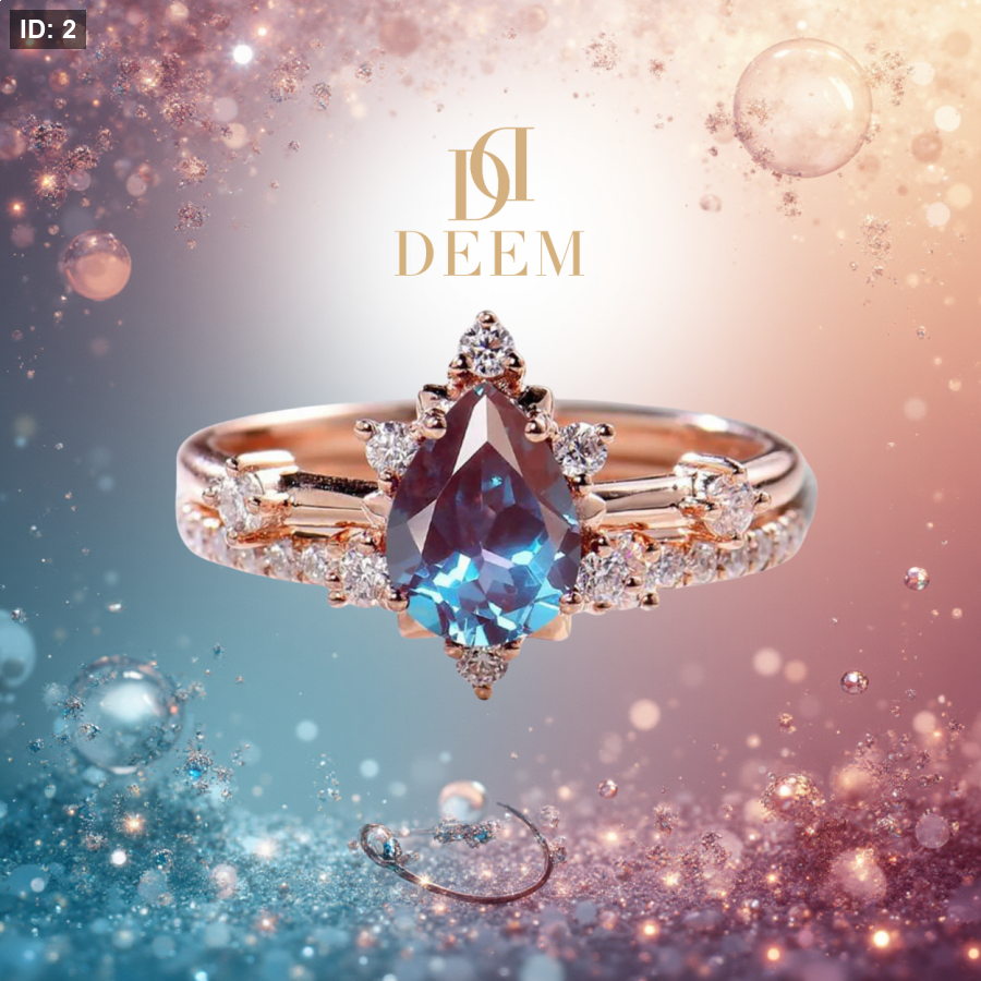 خاتم ملكي وأنيق مكون من قطعتين، مع حجر الإلكسندريت (Alexandrite) الذي يتغير لونه حسب الإضاءة، مما يجعله قطعة مميزة وفريدة. الطلاء روز جولد يضفي لمسة من الفخامة على التصميم، بينما تضفي أحجار الزركون لمعة إضافية. الحجر مُصمم بشكل كمثري (Pear Cut) ليكمل جماله الملكي.
