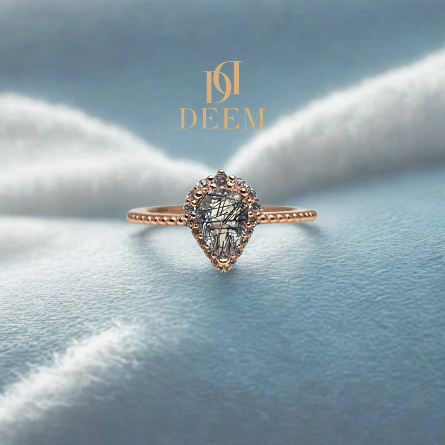 خاتم مكون من قطعة واحدة مصنوع يدويًا من الفضة الأصلية ومطلي روز جولد، مع حجر الروتيل الأسود (Black Hair Rutile) الذي يتميز بلونه الأسود الفريد وخطوطه السوداء الرقيقة داخل الحجر. التصميم يتميز بشكل كمثري (Pear Cut) ليعطي لمسة ساحرة على هذا الخاتم الفريد.