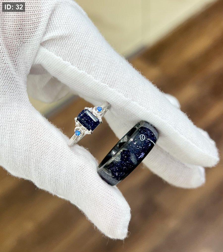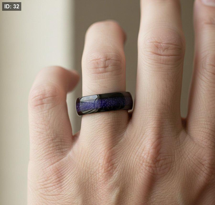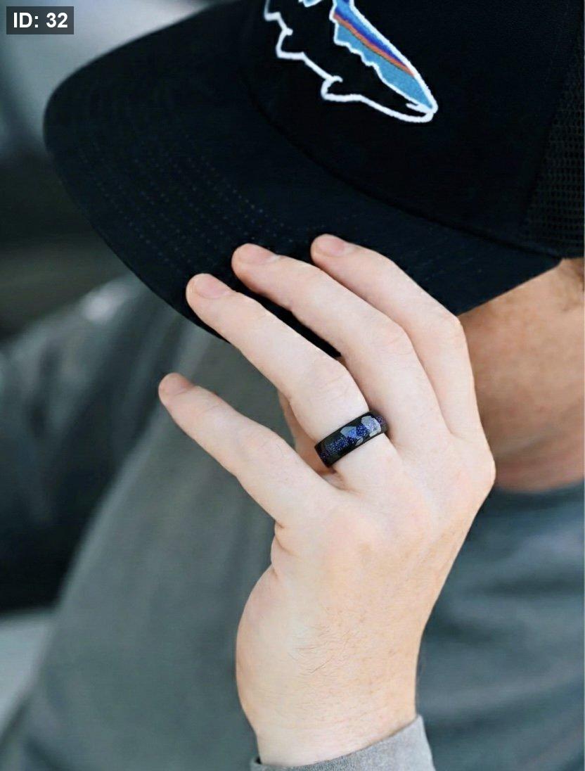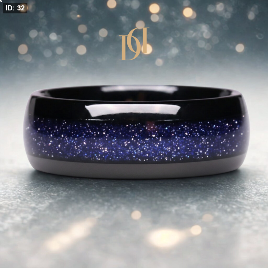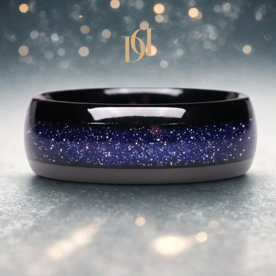 مصنوع من التنجستون كاربيد الأسود شديد المتانة، ويزدان بشريط من الحجر الرملي الأزرق المصنع في المختبر، الذي يعكس بريقًا يشبه سماءً مرصعة بالنجوم، كأنك تحمل مجرّة كاملة حول إصبعك.